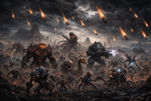 O impacto foi imediato e avassalador. O Império Vórmez, já combalido por três décadas de guerra, fragmentou-se em centenas de facções menores, cada uma lutando desesperadamente por sobrevivência e por qualquer fragmento de autoridade que pudesse reivindicar. Sem comando central, sem imperador, sem pátria-mãe, os vormezianos dispersaram-se pela galáxia como refugiados em sua própria diáspora, carregando apenas a dor de saberem-se um povo sem lar. Antes de desaparecerem nos confins da história e da memória galáctica, no entanto, os vormezianos deixaram um último e terrível legado, espalhado como sementes de veneno pelas galáxias: a ameaça latente dos biomonstros. Criaturas concebidas nos laboratórios secretos do Império durante os anos finais da guerra, essas aberrações genéticas — algumas capazes de dizimar colônias inteiras, outras programadas para se reproduzir em mundos terraformados — foram lançadas ao vácuo em cápsulas de contingência, um ato de vingança póstuma que transformaria a colonização do pós-guerra em uma caçada mortal por sobrevivência.